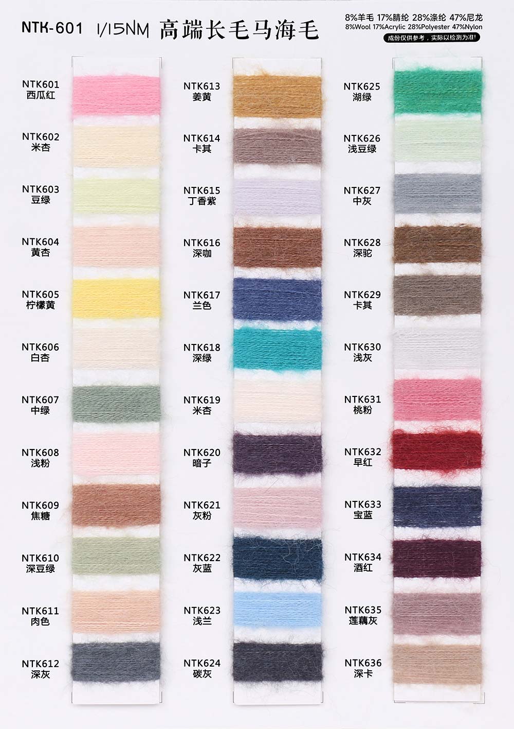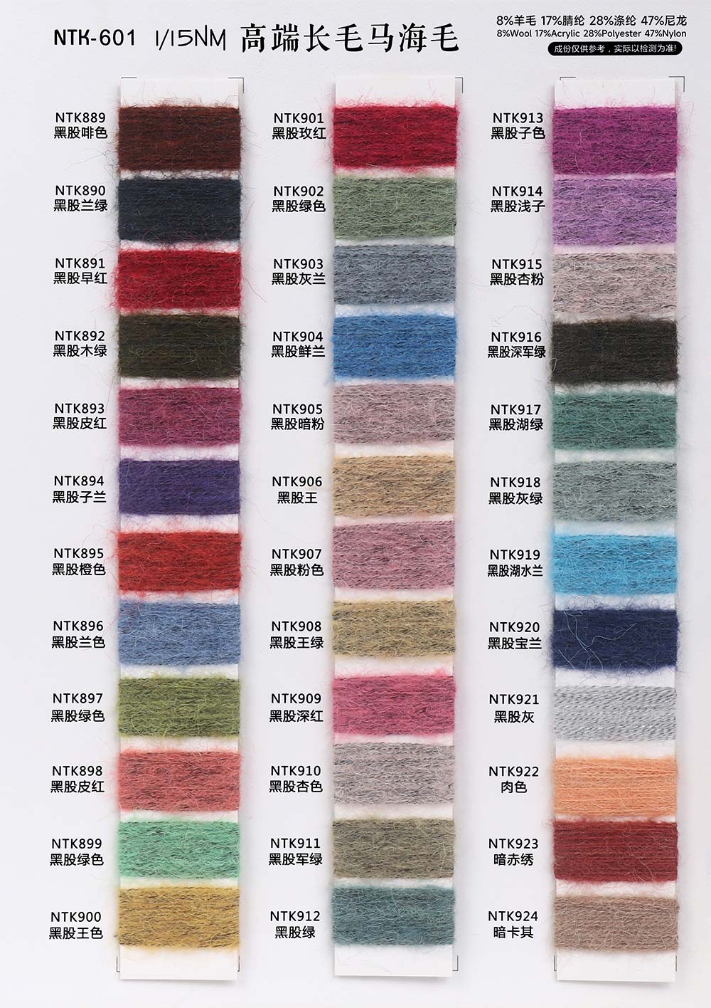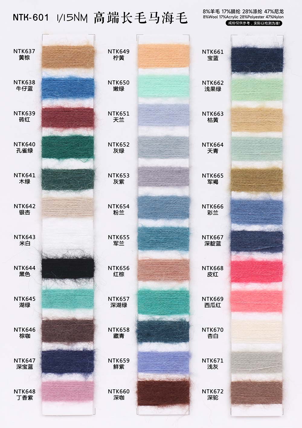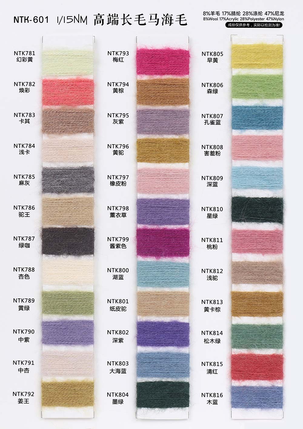 8%羊毛Wool 17%腈纶Acrylic 28%涤纶Polyester 47%尼龙Nylon