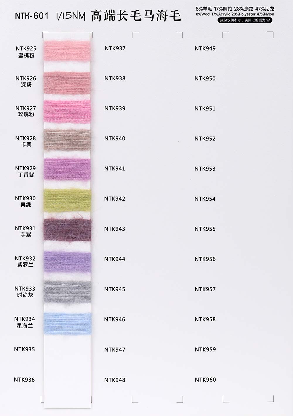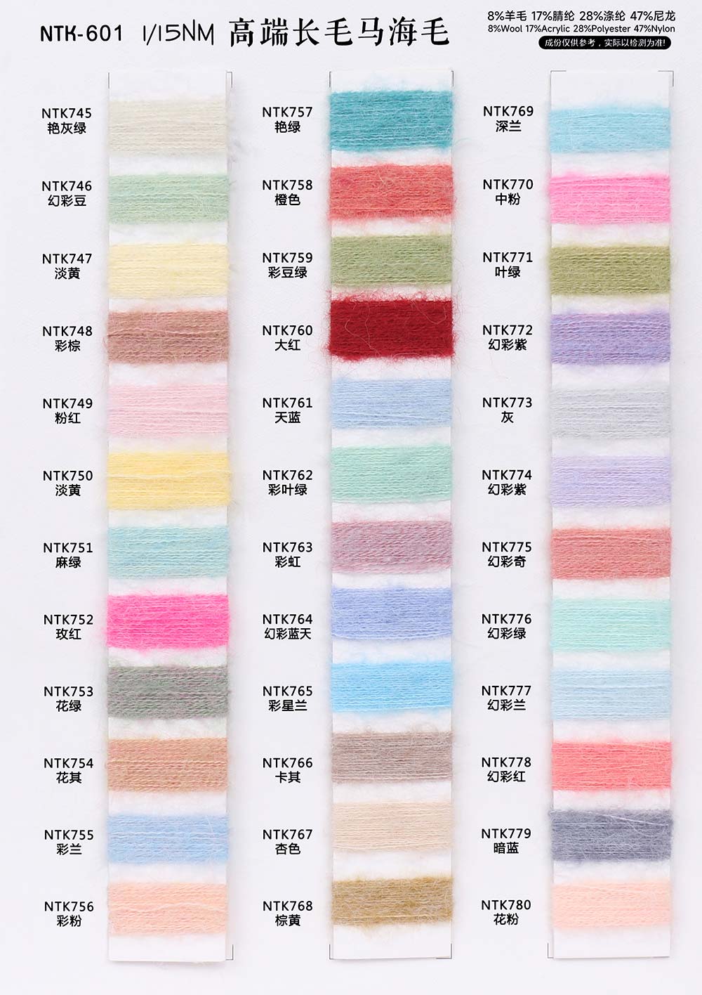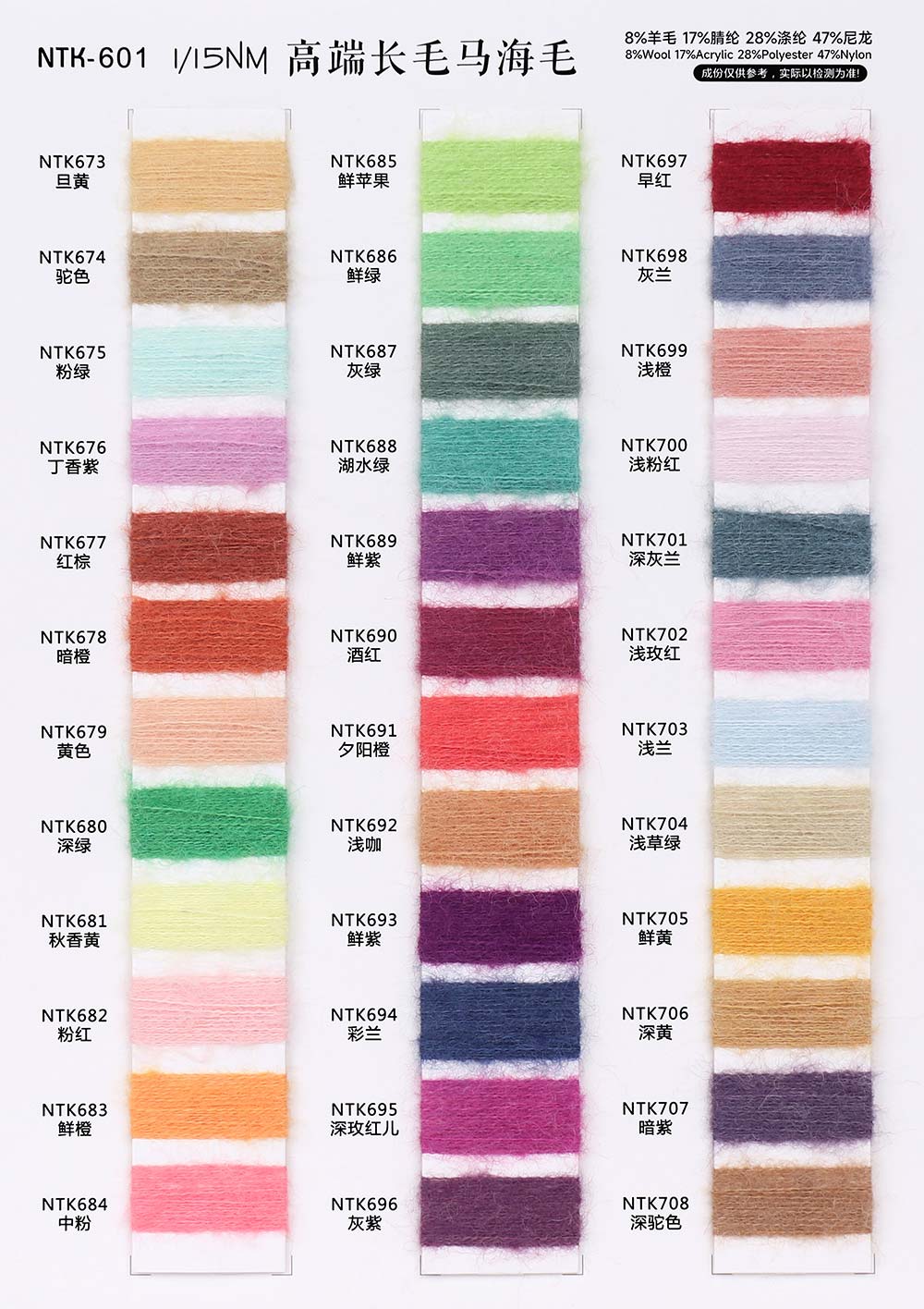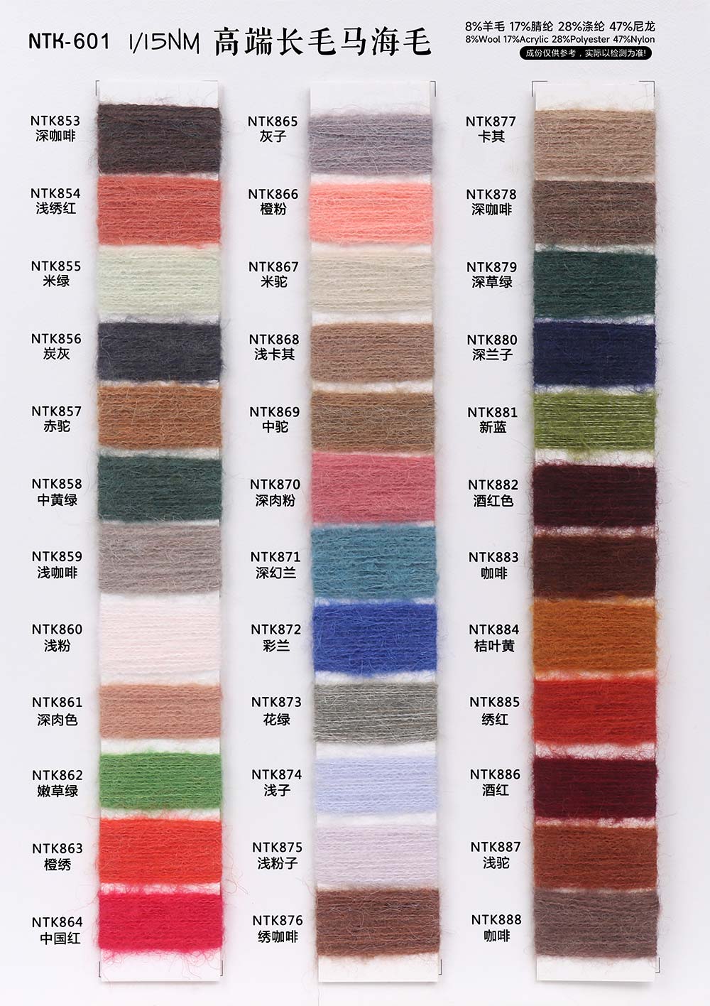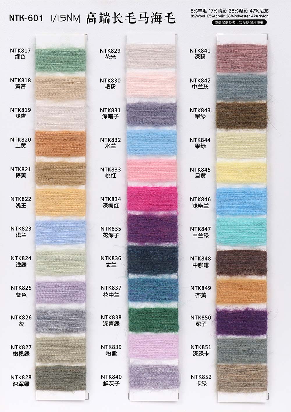 8%羊毛Wool 17%腈纶Acrylic 28%涤纶Polyester 47%尼龙Nylon