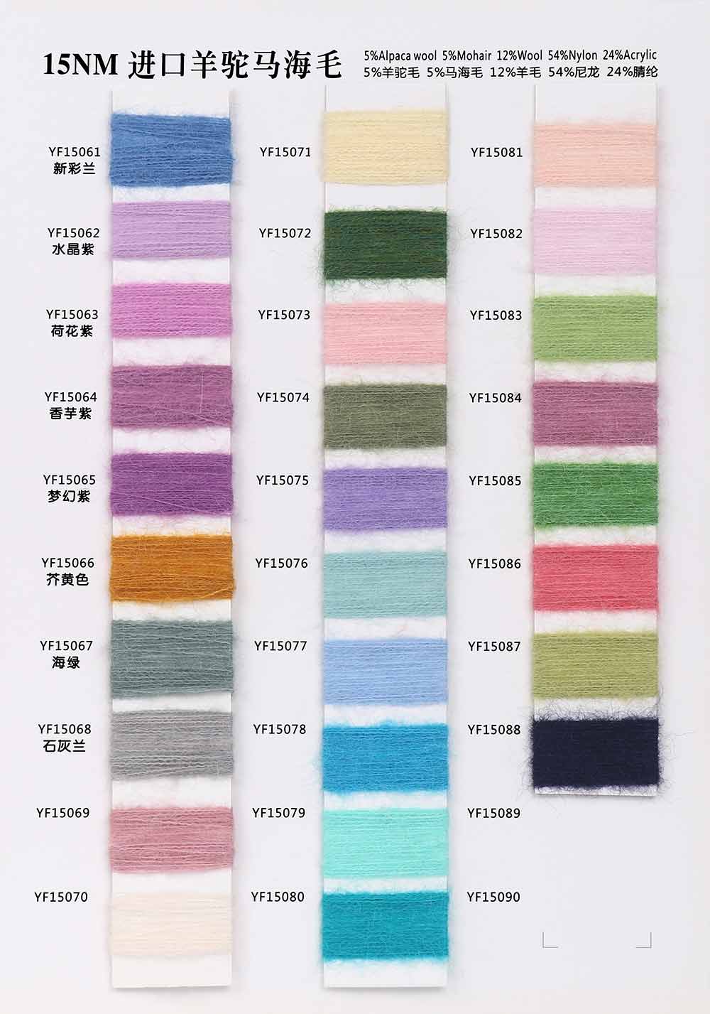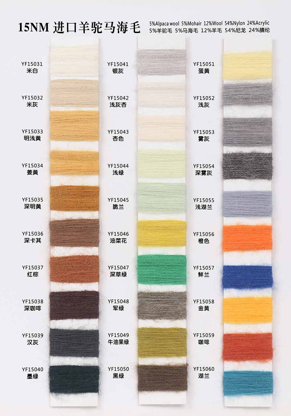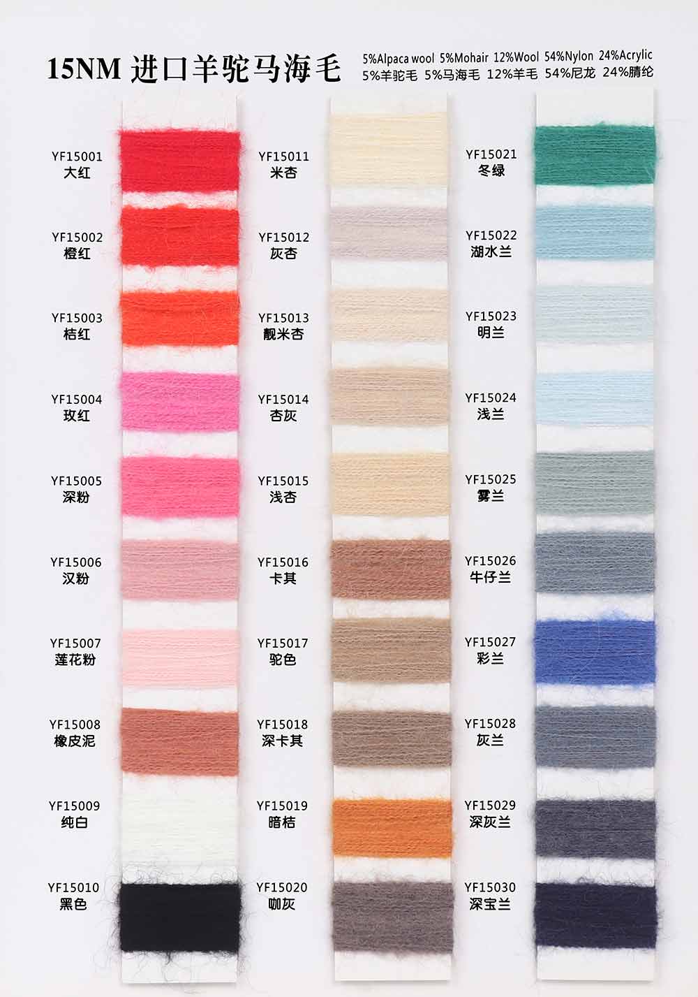 5%羊驼毛Alpaca wool 5%马海毛Mohair 12%羊毛Wool 54%尼龙Nylon 24%腈纶Acrylic